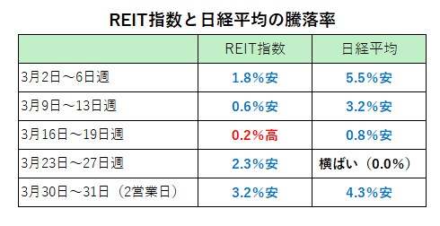 これを見ると、3月上旬のREIT指数は、日経平均が大きく崩れる中でも比較的値を保っていたと言えます。一方で、月の後半にかけては日経平均よりもパフォーマンスが悪い週があるなど、大きく崩れています。
