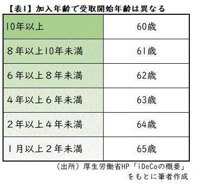 iDeCoは「早くても60歳にならないと受け取れない」ということはよく知られています。ただし、現行制度で60歳から受け取り始めるには、原則として10年以上の加入期間が必要です。加入期間が満たない場合、受取開始年齢が段階的に後ろ倒しになります【表】。