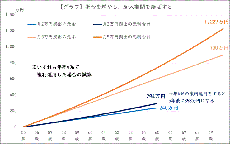 ですが、制度改正を迎えて毎月5万円を70歳まで拠出できるなら、掛金総額は900万円です。同じく年複利4%で運用できれば、70歳の時点で元利合計1,227万円に達し、資産は大きく膨らみます【グラフ】。