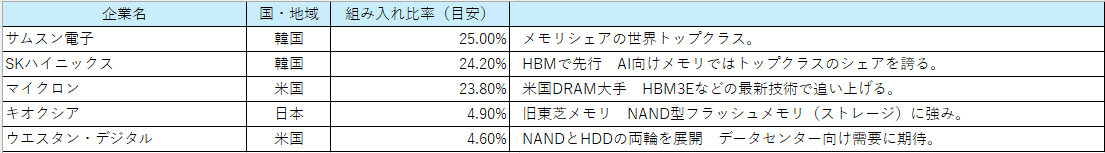 ETF「DRAM」の最大の特徴は、極端なまでの「集中」です。世界中のメモリ市場上位3社にポートフォリオの7割以上を配分しています。特に直接投資が難しい韓国のサムスンやSKハイニックスに対して、米ドル建てで一括投資できる利便性は、投資家にとって極めて高い価値があります。