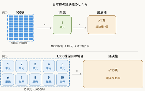 ちなみに、株主は1単元で1議決権をもらえます。現時点で日本株の売買は普通株式が100株単位に統一されましたので、100株で議決権1つ。1000株なら議決権は10個です。