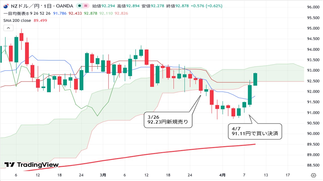 今回は、前回新規で売ったNZドル円の買い決済の話です。