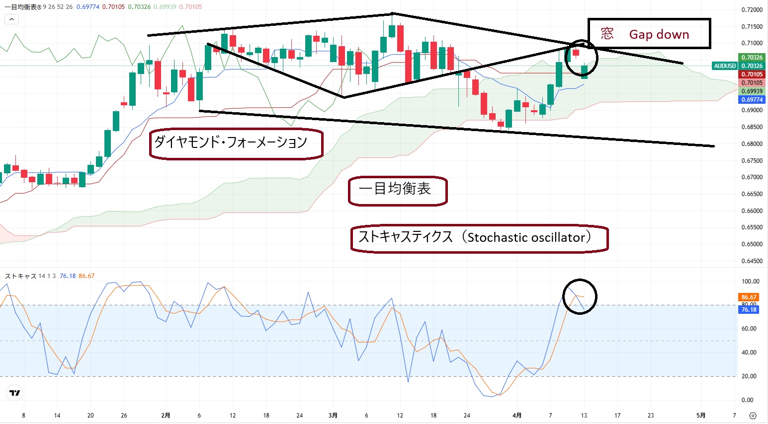 豪ドル/ドルは、0.7187ドルまで上昇した後、天井圏を示唆する「ダイヤモンド・フォーメーション」を形成しながら、窓を空けて下放れています。