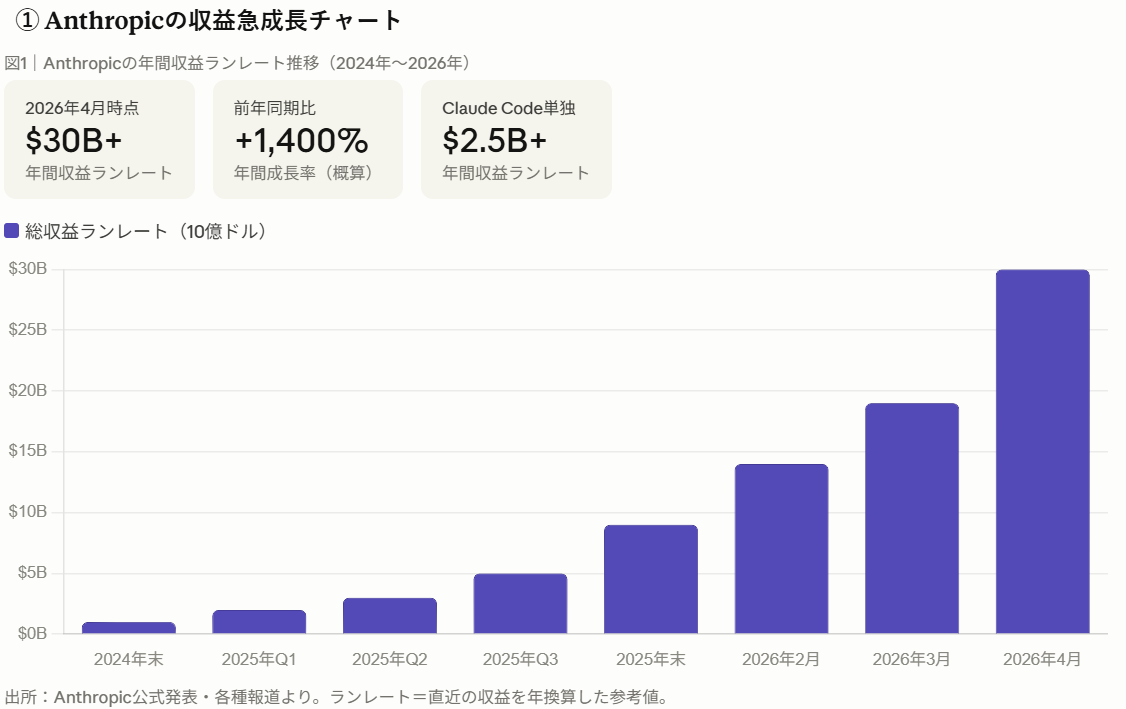 Anthropic(アンソロピック)は、2021年にOpenAIの元研究者たちが設立したAI安全性研究企業です。主力製品のClaudeはビジネス向けAIとして急成長しており、2026年4月時点の年間収益ランレートは300億ドル(約4.5兆円)を突破しました。