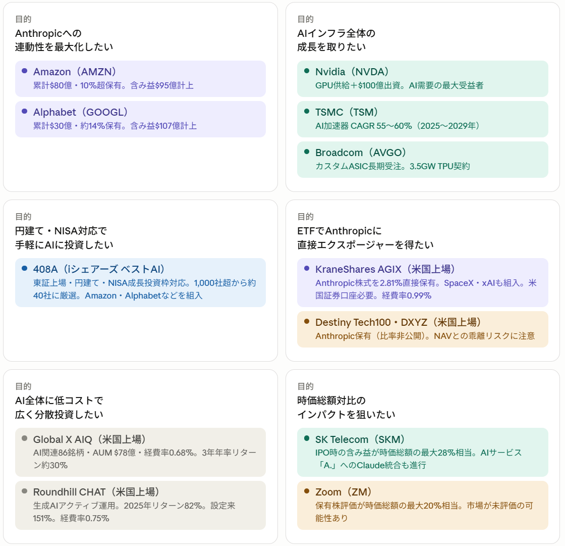 Anthropicへの直接投資はIPOまで難しい状況が続きますが、上記の銘柄やETFを活用することで、その成長の恩恵を間接的に取り込むことが可能です。