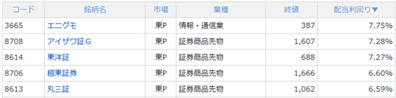 極東証券は業績が堅調に推移する前提であれば、安定した利回りが期待できそうです。アイザワ証券グループや極東証券、丸三証券は特別配当により一時的に配当利回りが上昇していますので、長期保有を目的とする場合は注意が必要です。エニグモについては、今期に配当利回りが大きく低下する可能性があります。