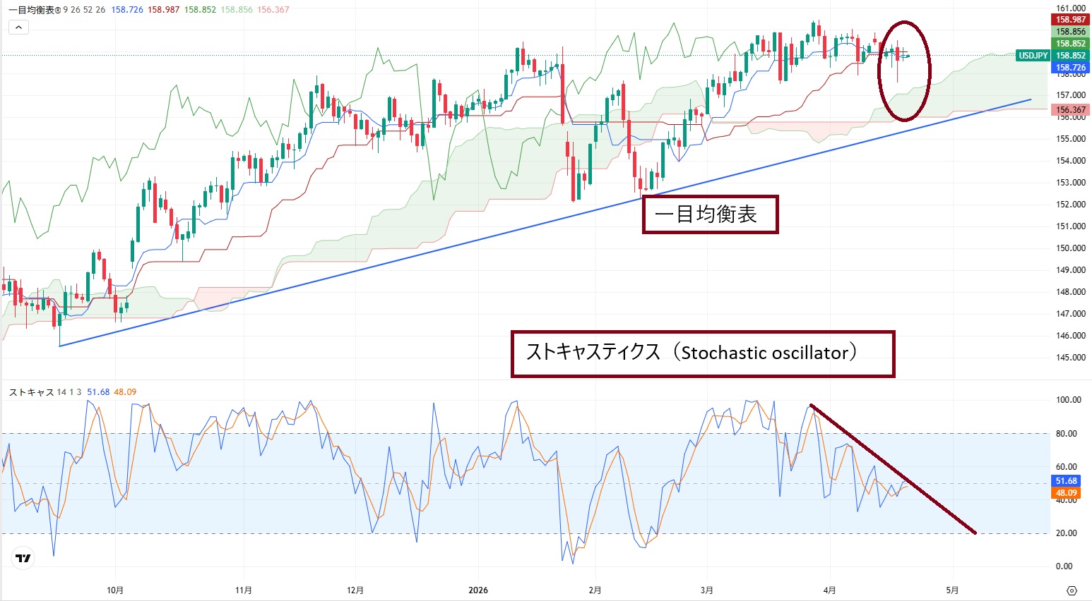 ドル円の一目均衡表でのテクニカル分析では、「二役逆転」となっており、売りシグナルが点灯しています。