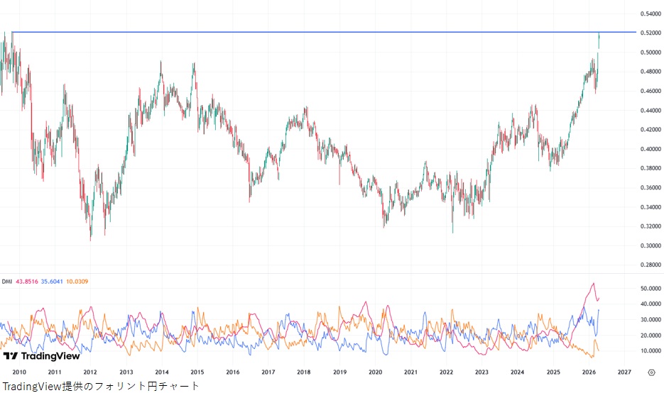 フォリント円は今月に入ってついに0.50円の大台乗せを達成。一時0.521円と2009年10月につけた重要な上値目標(チャート上の青色実線)に面合わせする場面も見られました。チャート下部に追加した「DMI」でも+DI>-DI(上昇トレンド)を示唆。トレンドの強さを示すADXも十数年来の高水準を維持しており、現在が明確な上昇基調であることを示しています。