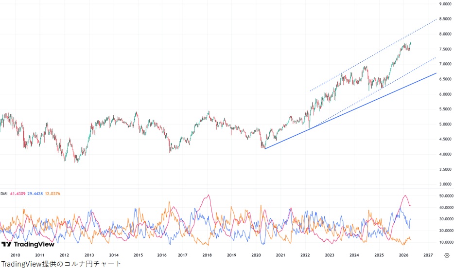 コルナ円は2020年5月安値を始点とする上昇トレンド(チャート上の青色実線)にあり、現在は2022年3月安値を始点とするより急激な上昇トレンド(チャート上の青色点線)に移行。足もとでは7.73円まで上値を伸ばし、史上最高値を更新しました。