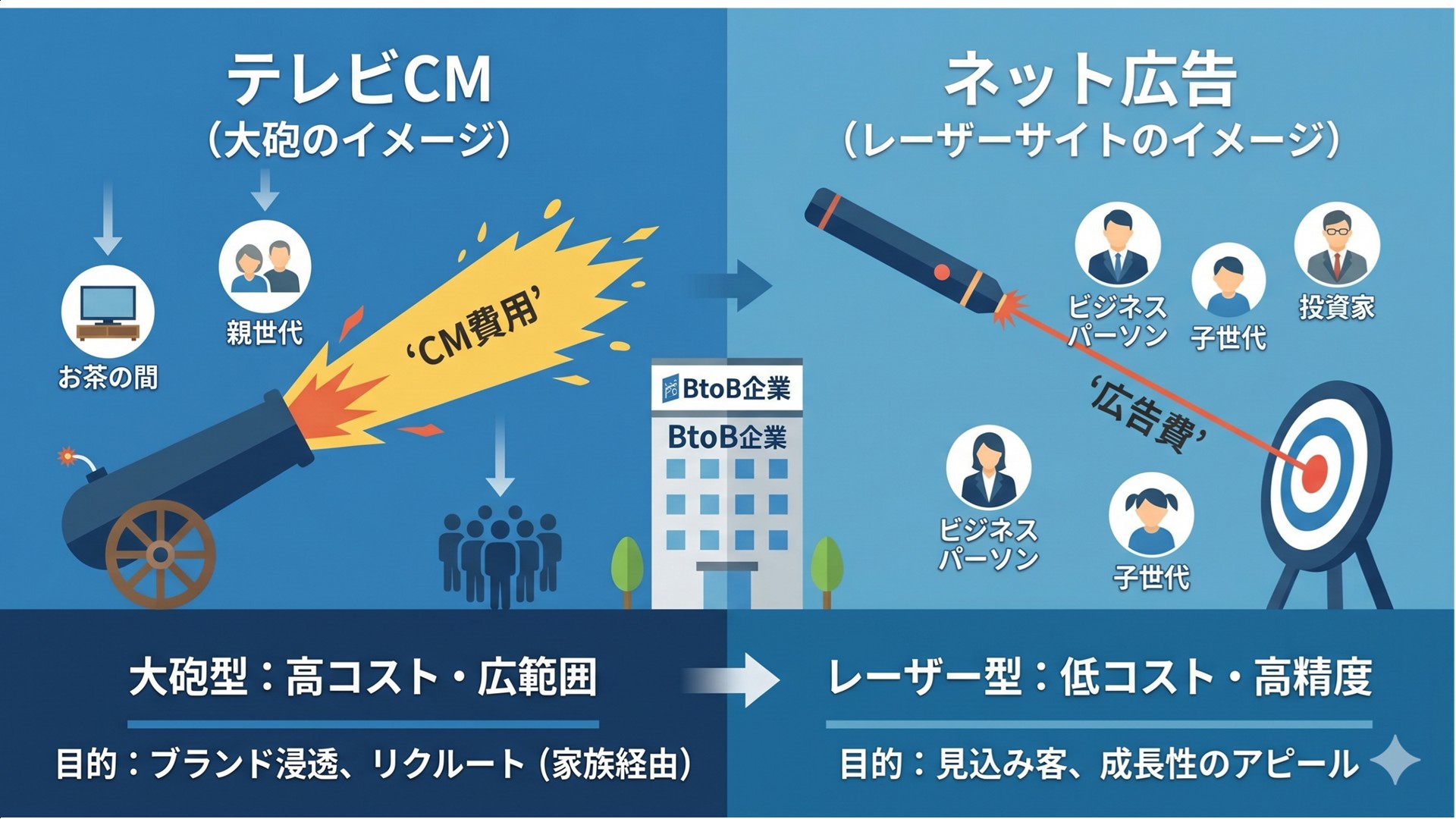 もちろん特定の世代に偏ったとしても、商品の購入(=売上)に直結するのであればまだ考えものです。それが上記のような中長期的な動機で放送するという難易度選択肢は、企業にとってもハードルが高いものです。そこで、インターネット広告という選択肢があります。
