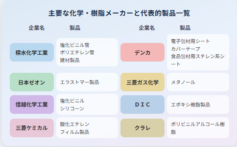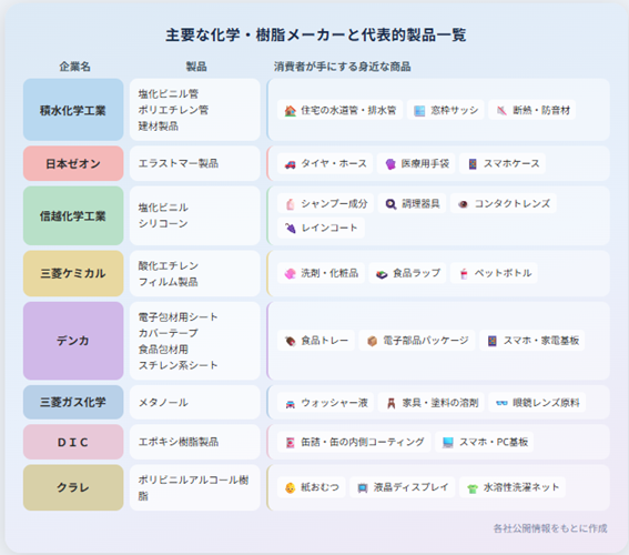 なんとなく何の用途で使われているか想像できるものもありますが、いまいちパッと思い浮かびませんね。これらの製品が何に使われているのか、消費者が手にするものにすると、例えばエストラマー製品はタイヤや医療用手袋、酸化エチレンは界面活性剤、食品包材用スチレン系シートは精肉や惣菜の白いトレーなどになります。