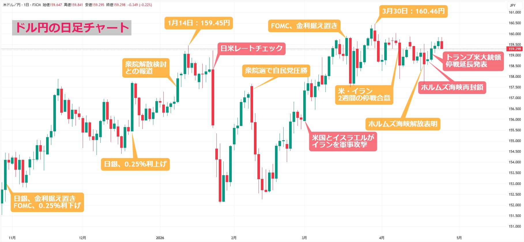 今週も為替、株式、債券、そして原油相場などの金融市場は中東関係のヘッドラインに振らされる展開となりました。ドル円は先週末17日にアラグチ・イラン外相が「レバノン停戦合意を受けて、ホルムズ海峡は停戦期間中、完全に開放される」と宣言し、トランプ米大統領も「ホルムズ海峡は完全に開放される」と表明。これを受けて、WTI原油先物価格が前日終値比で一時15%安の急落。株高とドル安が進む格好となりました。ドル円は一時157.59円まで値を下げています。