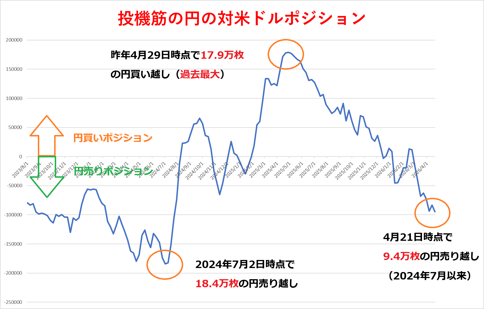 米商品先物取引委員会(CFTC)が24日(日本時間25日早朝)に発表した4月21日時点の建玉報告によると、シカゴ・マーカンタイル取引所(CME)の通貨先物市場で非商業部門(投機筋)の円の対ドル持ち高は9万4460枚の円売り越し(ドル円のロング)となり、前週から1万1252枚増加しました。これは2024年7月23日以来の水準です。