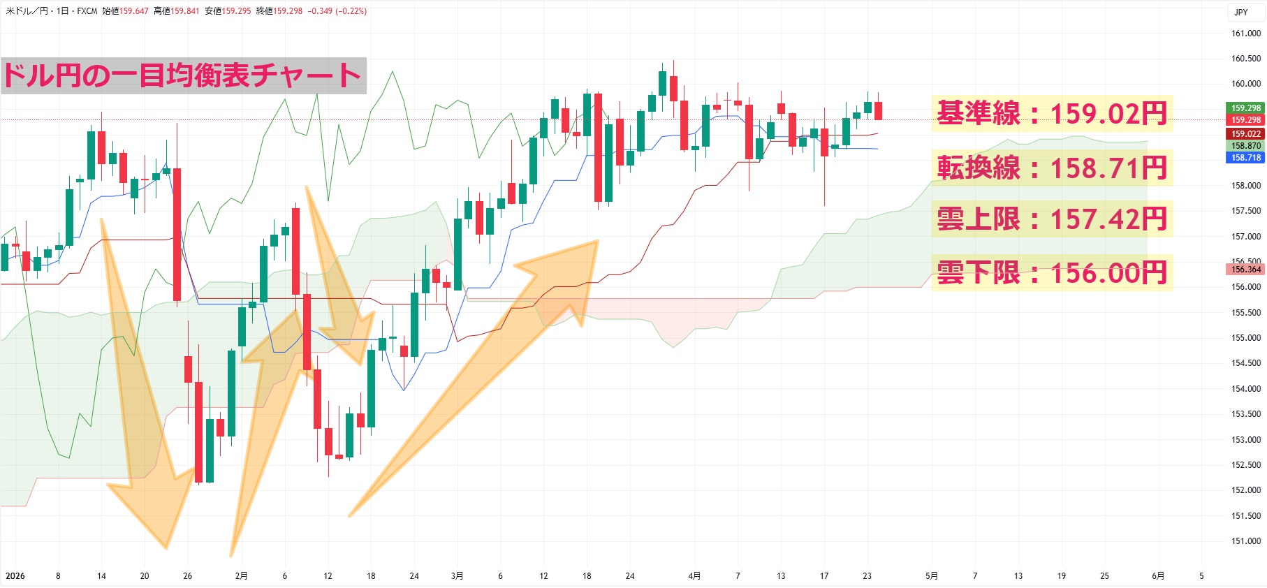 ドル円の一目均衡表チャートを見ると、週末の終値(159.38円)で雲の下限156.00円、上限157.42円、転換線158.71円、基準線159.02円を全て上回っています。雲は徐々に厚くなっており、テクニカル的に上サイドへの期待が高まる状況です。また、材料的にも依然として「円安」と「ドル高」の両方を備えている状況です。当面は円安・ドル高のトレンドが続くとみる市場参加者は多いようです。来週27-28日の日銀金融政策決定会合を通過すれば(市場は据え置き予想)、いつものように円売り・ドル買いが強まる可能性もありそうです。