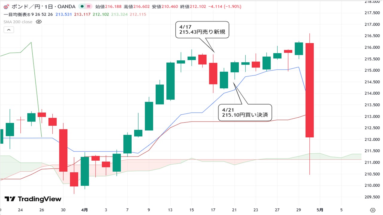 ちょうど216円攻略に手こずる中でポンド売り材料が出たことで、下値を探るかという見立てでポンドを売ってみました。